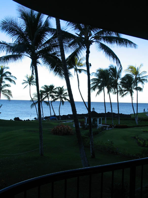 View from our little deck, looking west at sunrise, Hilton Waikoloa Village, Hawai'i