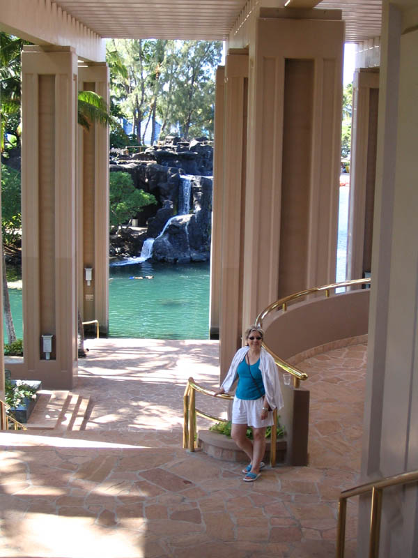 Patti, grand staircase and waterfall, Hilton Waikoloa Village, Hawai'i